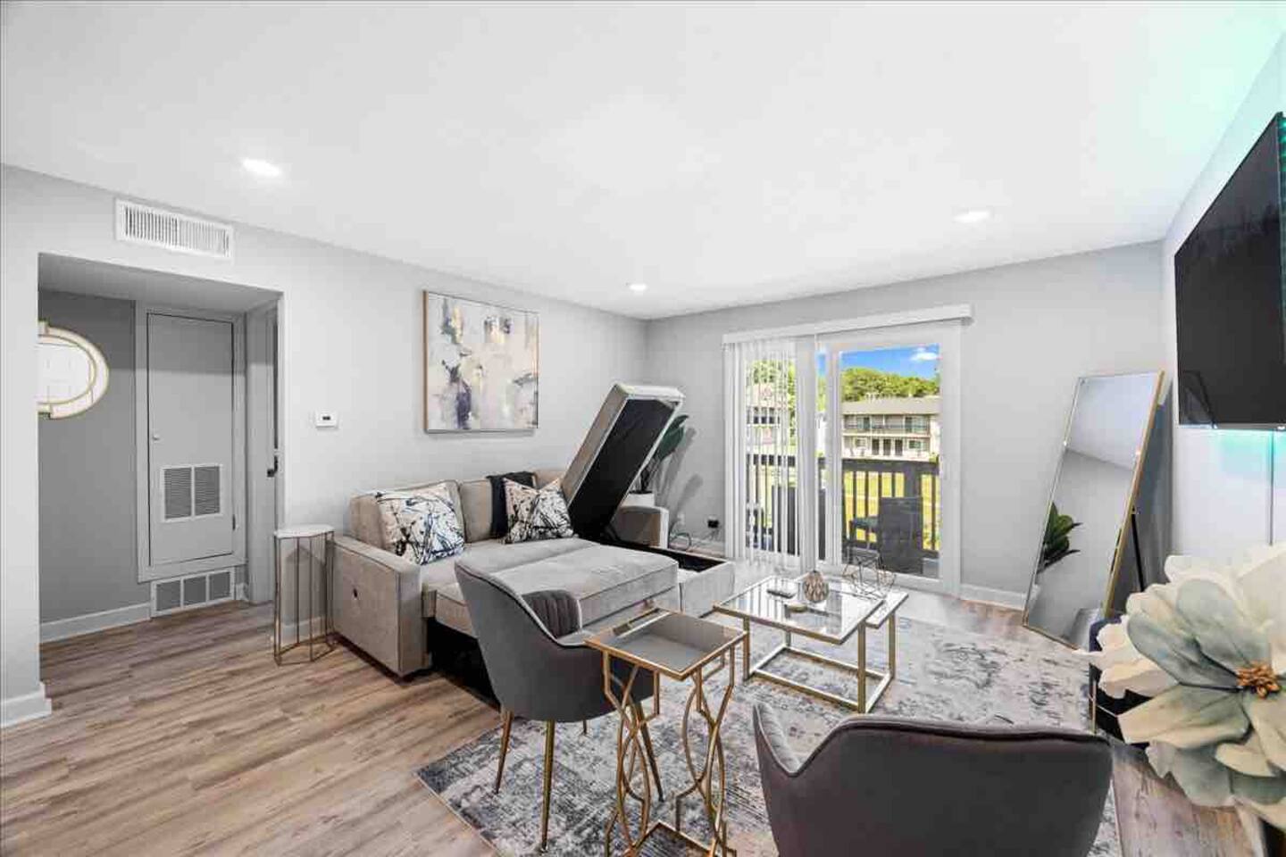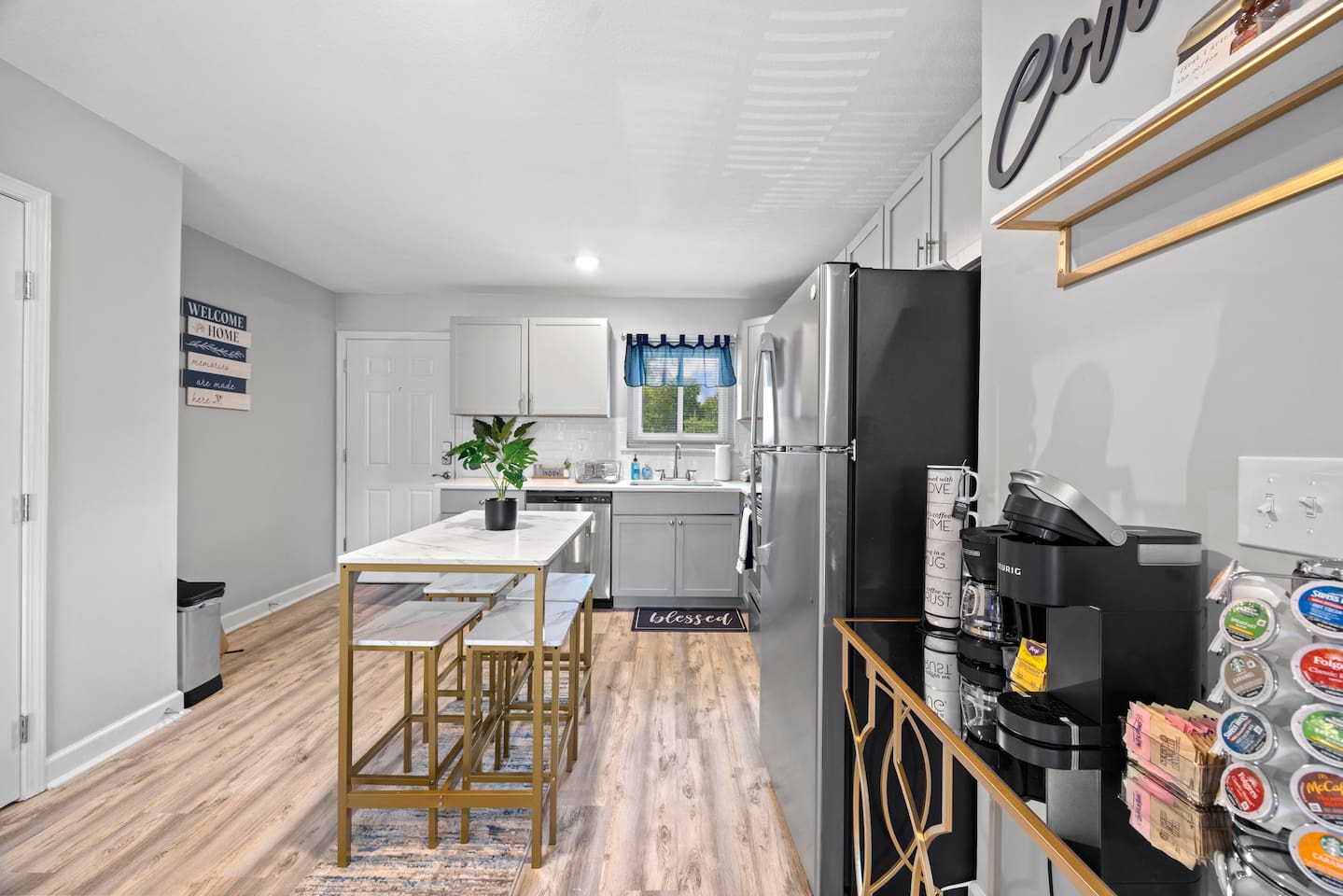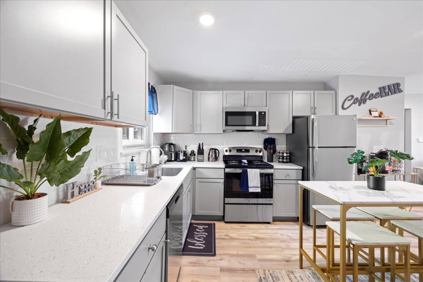 The bedrooms offer ample space, and the home features two Queen beds along with a sleeper sectional that also provides storage. Start your mornings by enjoying the provided Keurig coffee in the modern kitchen. Stay connected with blazing fast WiFi available throughout the entire home.